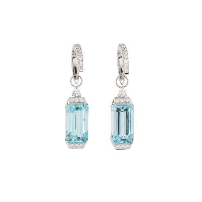 Each composed of a diamond-set hoop, suspending a cut-cornered rectangular-cut aquamarine and small round brilliant-cut diamonds, post and clip fittings, stamped 18k