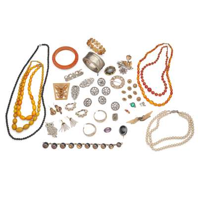 Mainly 20th century vintage pieces including; various beaded necklaces and bracelets, bangles, earrings, buttons and various brooches including some late 19th century examples and a small collection of rings and belts, a small selection of silver Celtic style brooches and amber jewellery (Qty)
