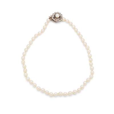Composed of a single row of cultured pearls, to a floral clasp set with a central cultured pearl and eight-cut diamonds, unmarked