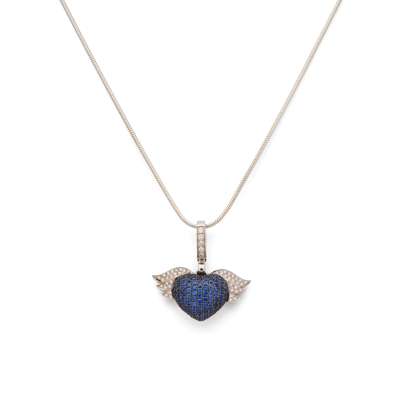 Modelled as a winged heart pavé-set with round-cut sapphires and diamonds, signed, stamped 750; to an unassociated snake link chain
