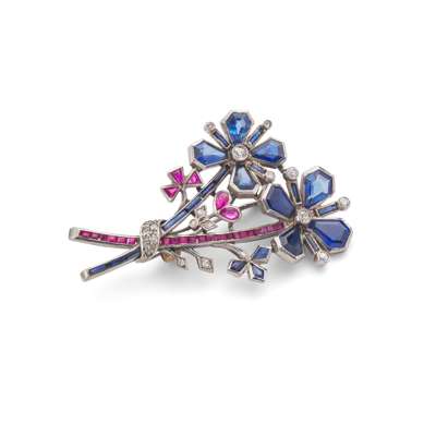 Collet-set with various tapered step-cut sapphires, square step-cut rubies and small round brilliant-cut diamonds, unmarked