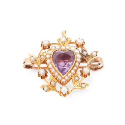 Collet-set with a heart-shaped amethyst in a stylised floral surround set with seed pearls, modelled in 9ct gold