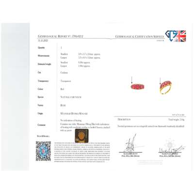 Accompanied by a GCS report no. 5784-0212, dated 31st October 2023, stating that four of the cushion-cut Burmese rubies are from Mogok, showing no signs of heating; one is from Mong Hsu showing indications of heating with moderate residue in healed fissures.