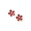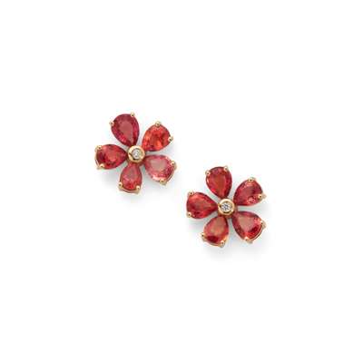 Each modelled as a flower-head claw-set with five pear-shaped orange sapphires and a central round-cut diamond, post and butterfly fittings, stamped Au750
