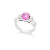 Claw-set with an oval-cut pink sapphire, weighing approximately 0.90cts, each shoulder set with two round brilliant and tapered baguette-cut diamonds, unmarked