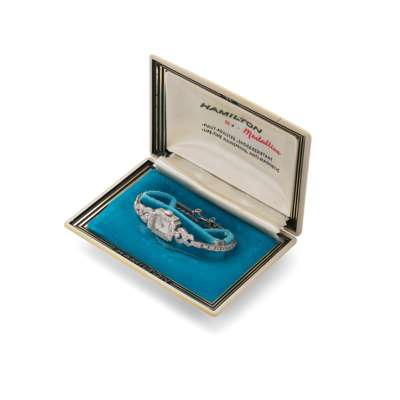 The rectangular dial with Arabic, dot and baton indicators, the bezel and shoulders set with round and eight-cut diamonds, stamped 14k GOLD; with box