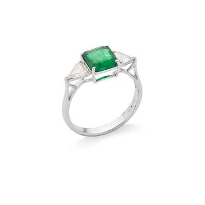 Claw-set with a cut-cornered square-cut emerald and two trilliant-cut diamonds, stamped 18k