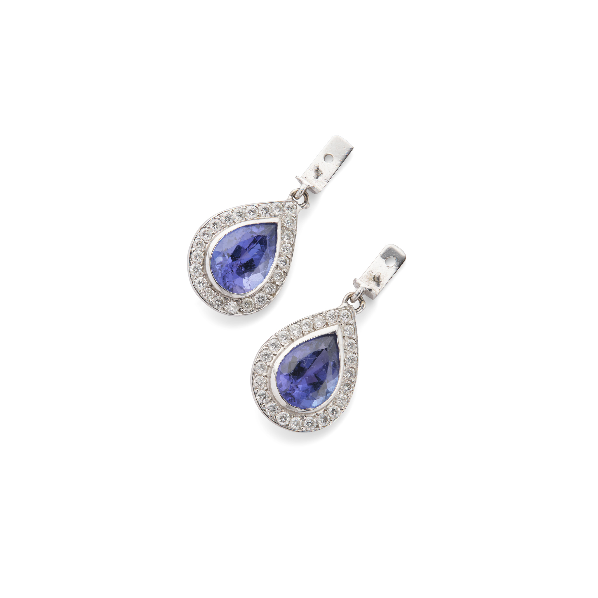 Designed to be suspended from a stud earring, each collet-set with a pear-shaped Tanzanite in a border of round brilliant-cut diamonds, unmarked