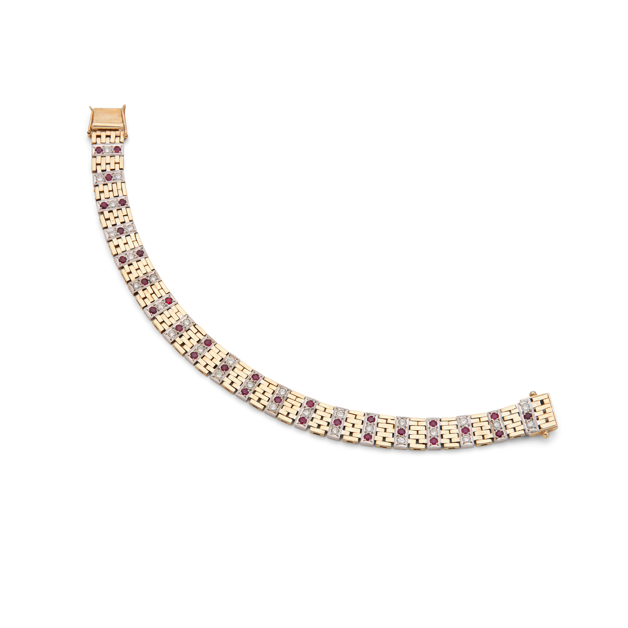 Composed of rectangular links set with round brilliant-cut diamonds and rubies, between polished brick-links, UK hallmarks