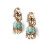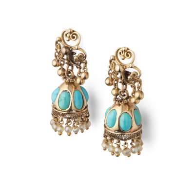 Each scrolling surmount suspending four small beaded drops, and a central pendant set with turquoise cabochons and seed pearl detail, clip fittings, unmarked