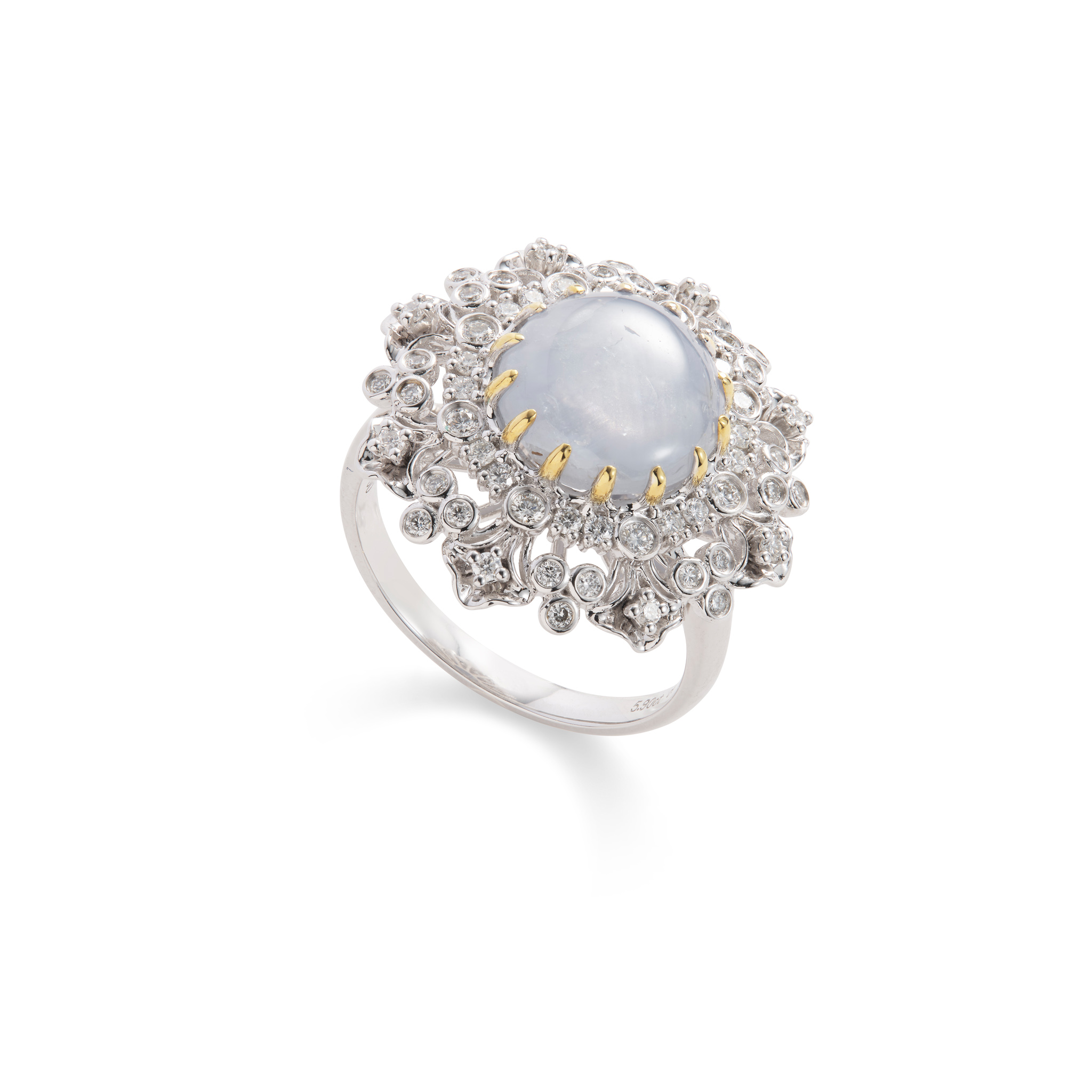 Claw-set with a circular cabochon star-sapphire, in a stylised border of round brilliant-cut diamonds, plain band, stamped Au750