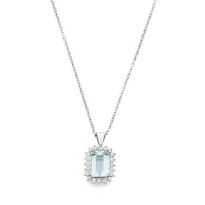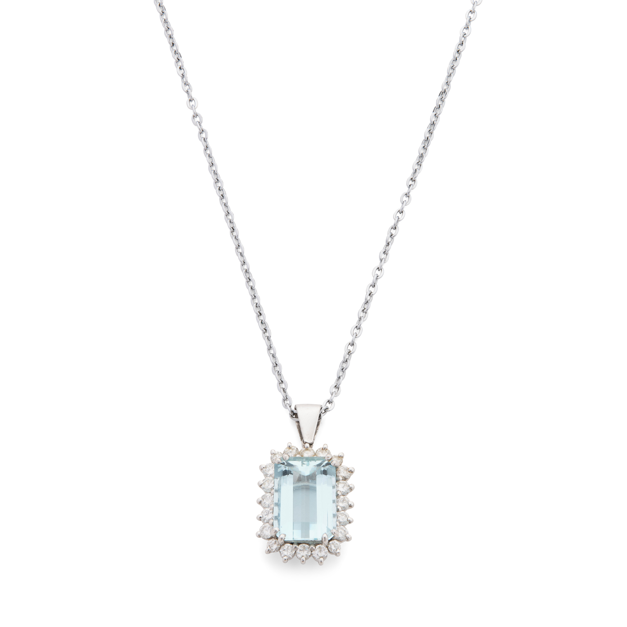 Claw-set with a rectangular step-cut aquamarine in a border of small round brilliant-cut diamonds, trace-link chain, unmarked