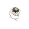 Claw-set with a cushion-cut green tourmaline, in a border of sixteen round brilliant-cut diamonds, plain band, stamped 18ct