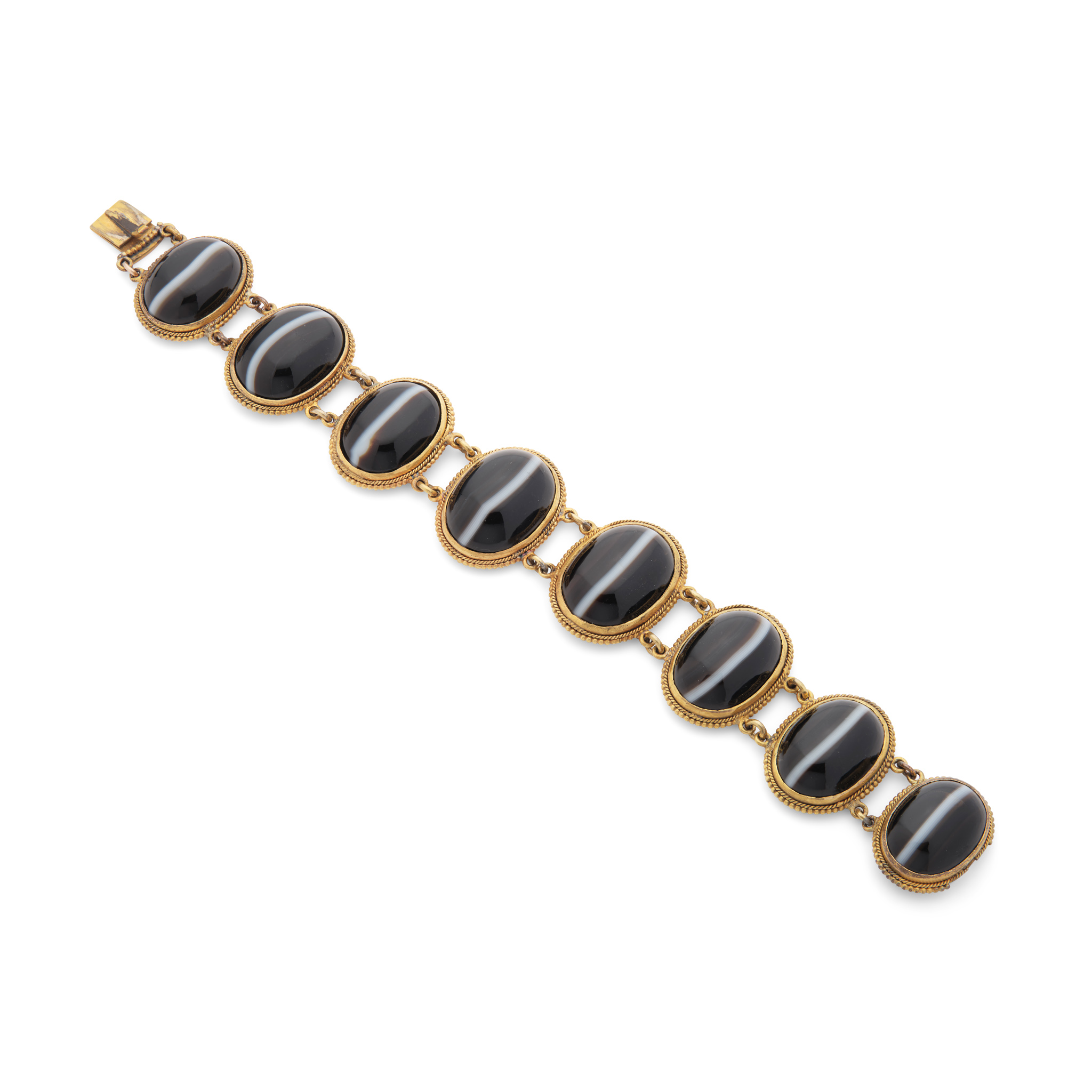 Each oval link set with a graduated cabochon banded agate, in a rope-twist border, unmarked