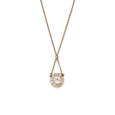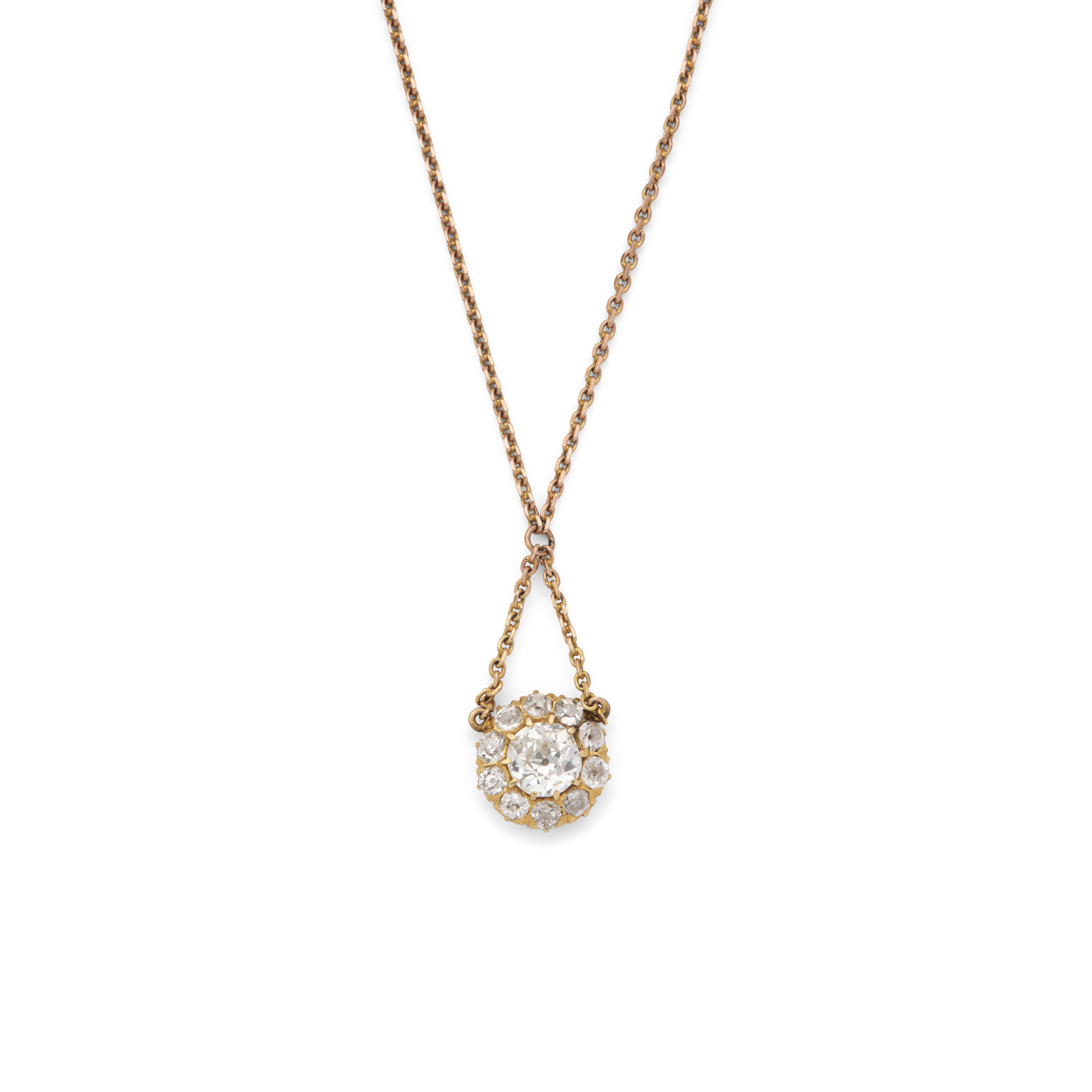 Claw-set with an old round-cut diamond, weighing approximately 1.00ct, in a border of ten smaller old round-cut diamonds, trace-link chain, unmarked