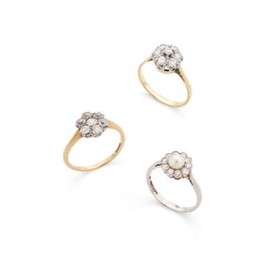 Including two old round-cut diamond cluster rings, plain bands, one stamped 18ct; together with an (untested) pearl and diamond cluster ring, stamped 18CT PLAT (3)