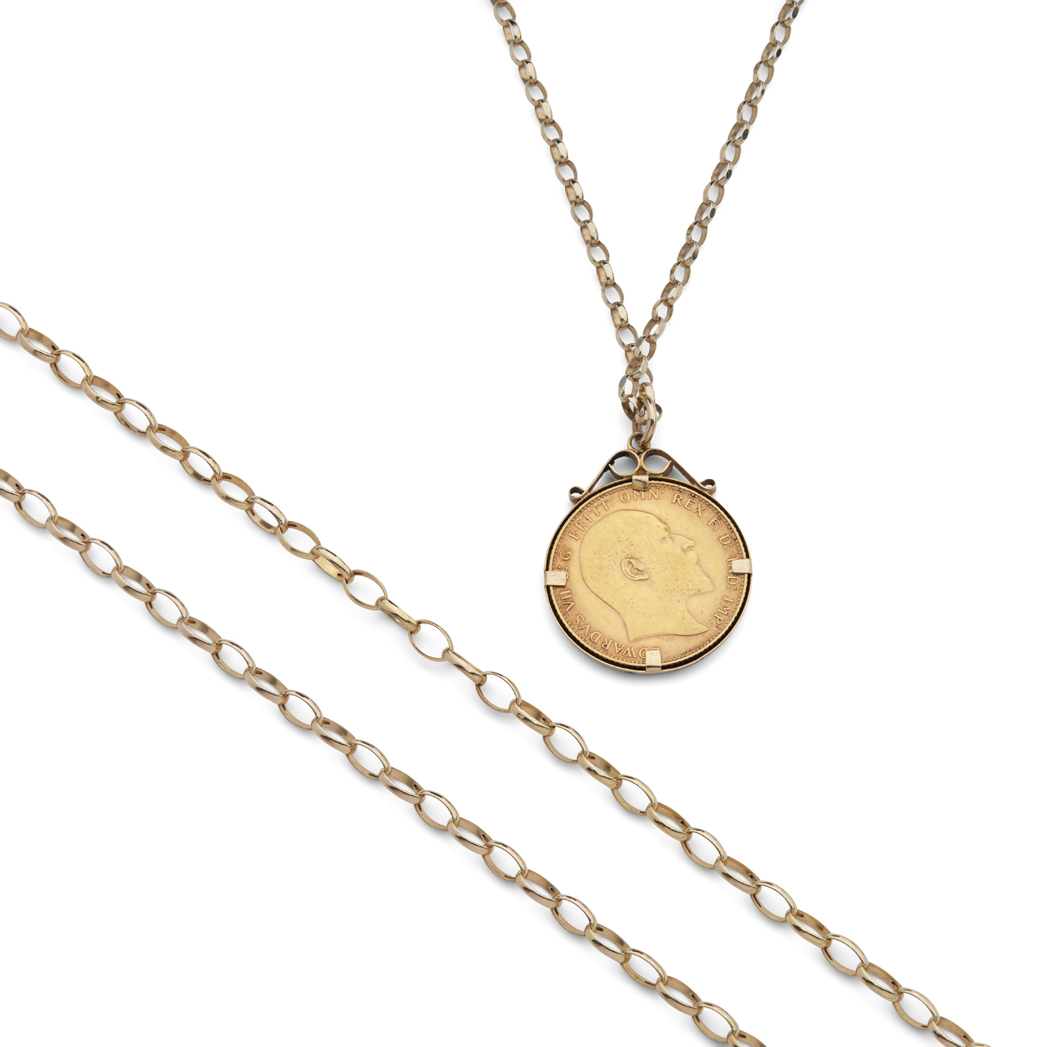 Collet-set with a 1907 sovereign in a detachable 9ct gold mount and belcher-link chain, UK hallmarks; together with another 9ct gold neck-chain (2)