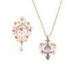 The first of open scrolling form, set with a central oval-cut amethyst and seed pearl detail, stamped 9ct, trace-link chain; the second also of open scrolling form, set with round-cut pink sapphires and seed pearls, stamped 9ct (2)