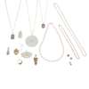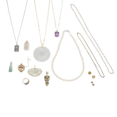 Including a cultured pearl necklace, a 9ct gold garnet and colourless gem ring; a citrine and seed pearl brooch, stamped 15ct; an amethyst pendant necklace, various jade and green-hardstone pendants; a pair of diamond stud earrings, and a pair of citrine stud earrings; various other gem-set pendants and earrings (qty)