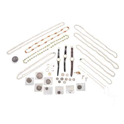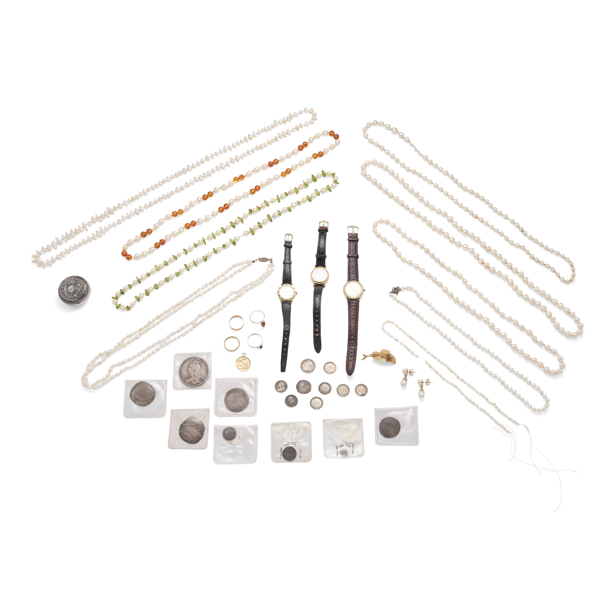 Including a French gem-set brooch modelled as a lady's hat, by Kirby Paris; various cultured pearl necklaces, a 22ct wedding band and an 18ct wedding band; an 1895 half sovereign pendant; a pair of imitation pearl earrings, two amber rings; three fashion watches by Lotus, Gucci and Omega; a silver snuff box and various coins (qty)