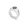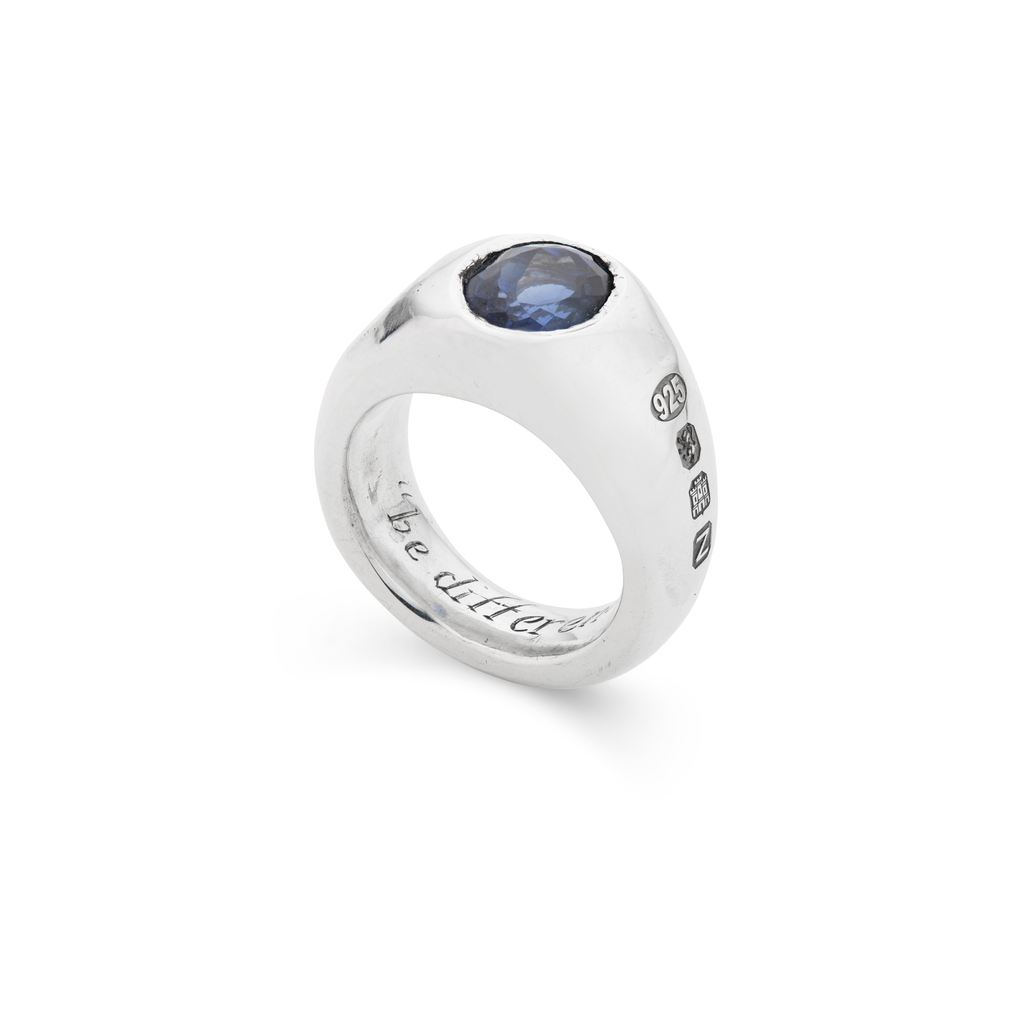 Collet-set with an oval-cut sapphire, in a bold mount, engraved ‘Be Different’, UK hallmarks