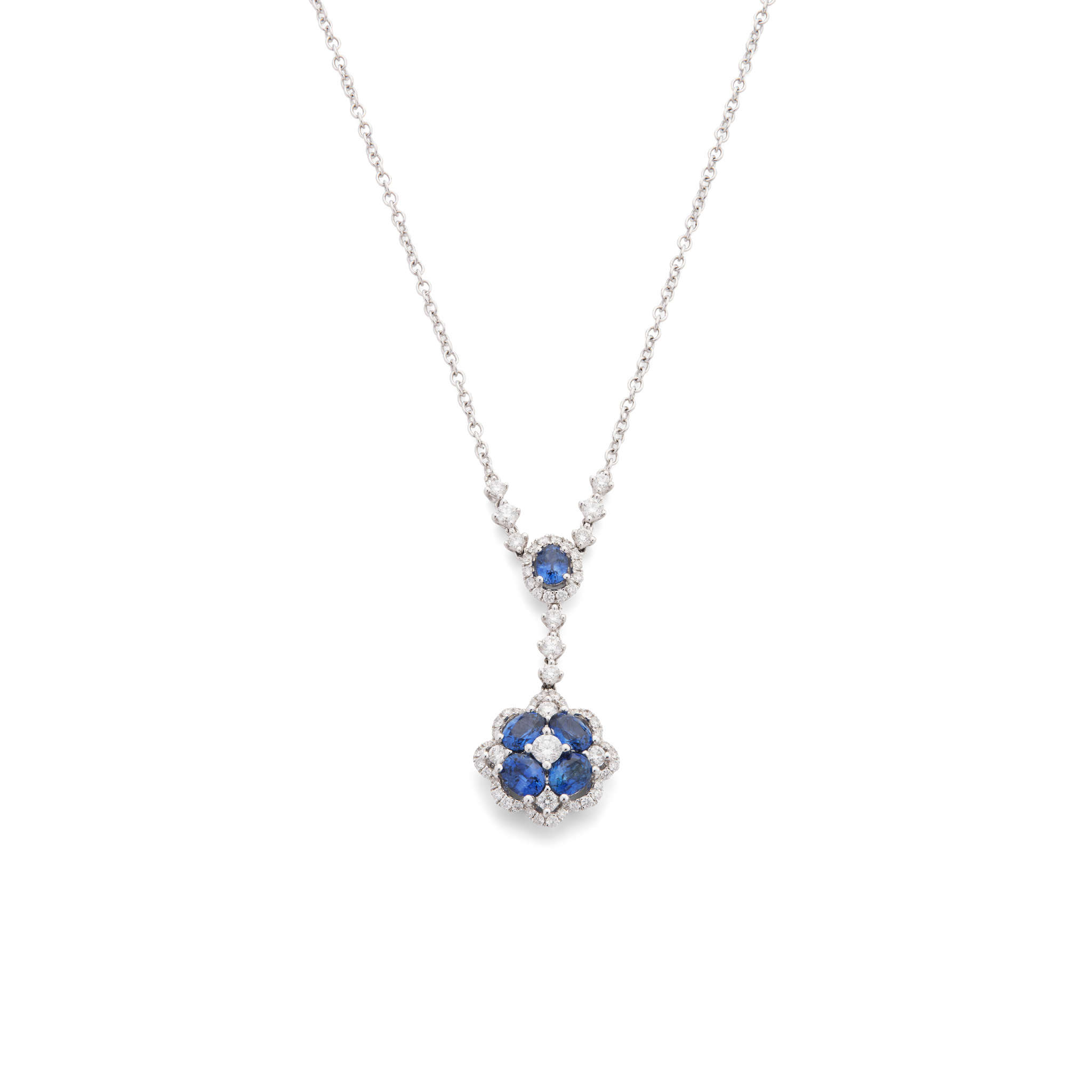 Claw-set with oval-cut sapphires and graduated round brilliant-cut diamonds, trace-link chain, stamped 18K 750