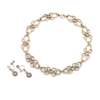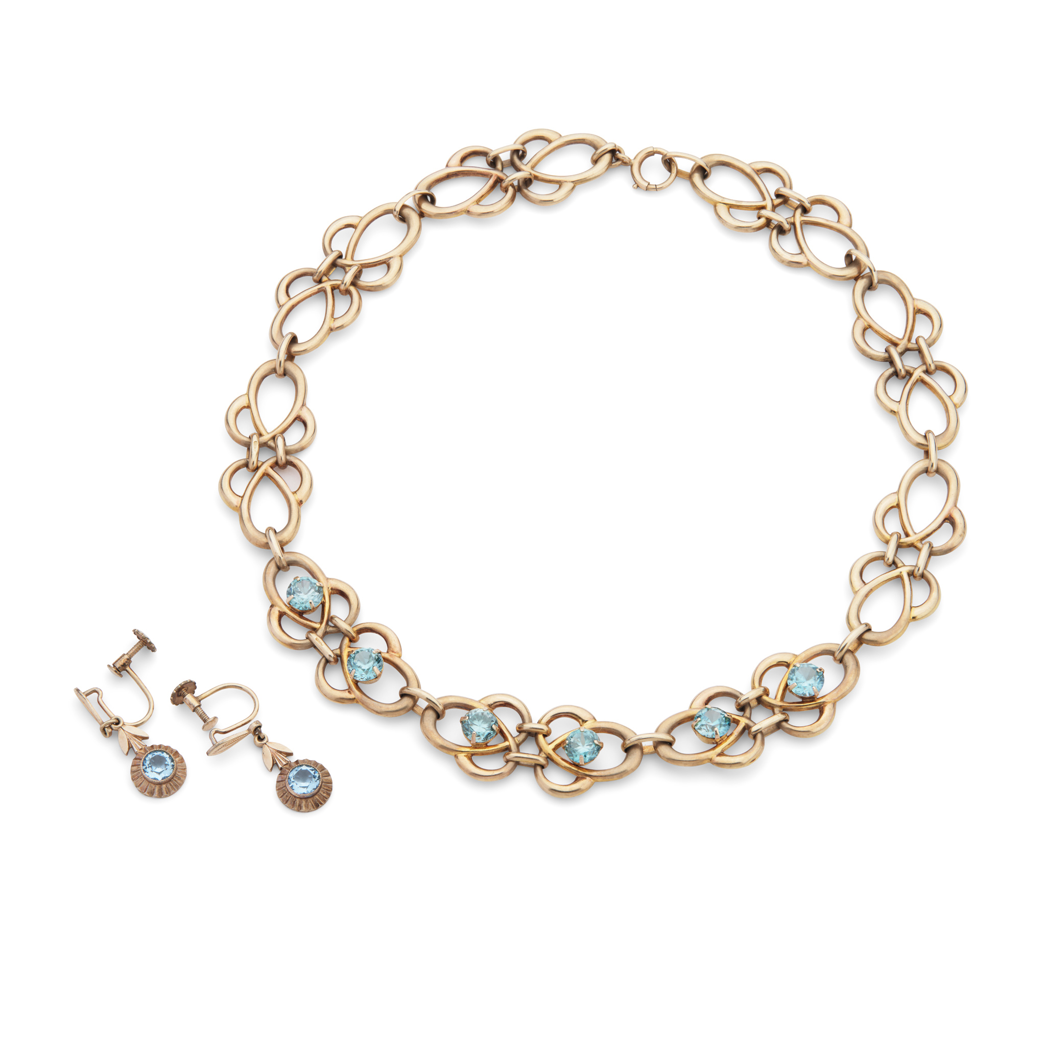 Composed of pierced scrolling links, claw-set with six round-cut blue zircons, UK hallmarks; together with a pair of matched blue paste pendent earrings (2)
