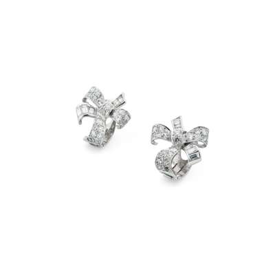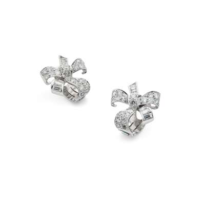 Each modelled as a stylised bow, set throughout with eight-cut and baguette-cut diamonds, clip fittings, unmarked