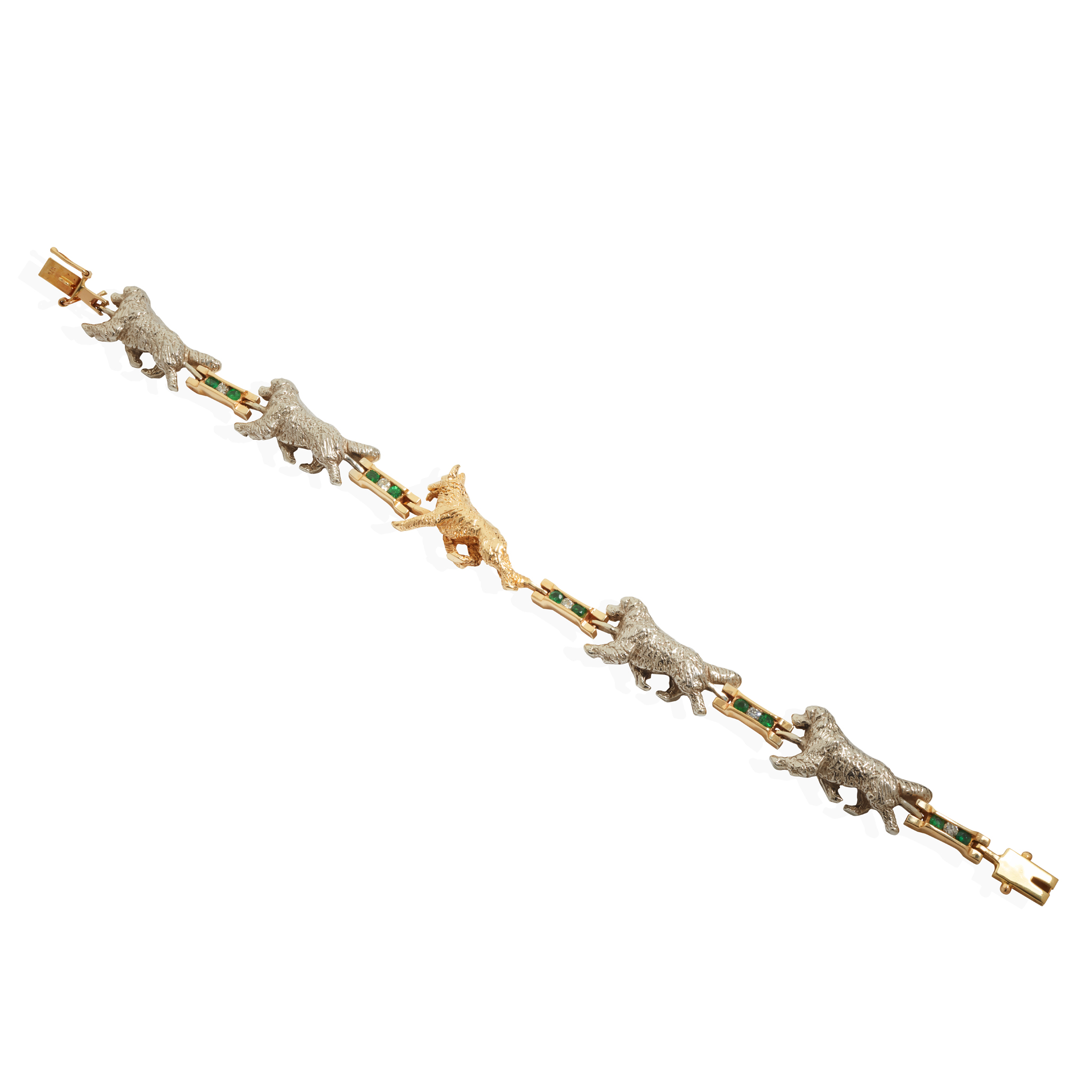 Composed of four cast Golden Retrievers and a German Shepherd, between joining links each channel-set with two round-cut emeralds and a round brilliant-cut diamond, stamped 14k