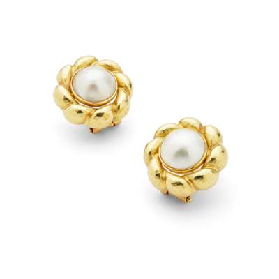 Each collet-set with a mabé-pearl, the ribbed border with hammered finish, clip fittings, signed, stamped 750, import hallmark; in original box
