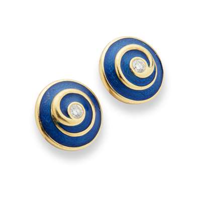 Each of round spiralling design, collet-set to the centre with a round brilliant-cut diamond to a blue guilloché enamel ground, post and clip fittings, numbered 2/500, Fabergé mark, also marked NBY, UK hallmarks