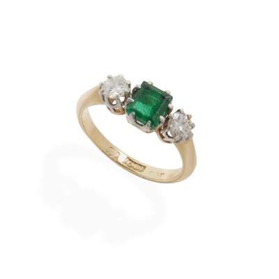 Claw-set with a square step-cut emerald and two round brilliant-cut diamonds, plain band, stamped 18ct