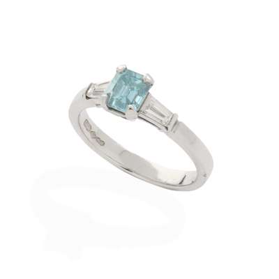 Claw-set with a rectangular step-cut fancy blue diamond, weighing approximately 0.85cts, each shoulder set with a tapered baguette-cut diamond, plain band, UK hallmark