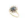 Claw-set with an oval-cut sapphire, in a border of round brilliant-cut diamonds, plain band, stamped 18ct