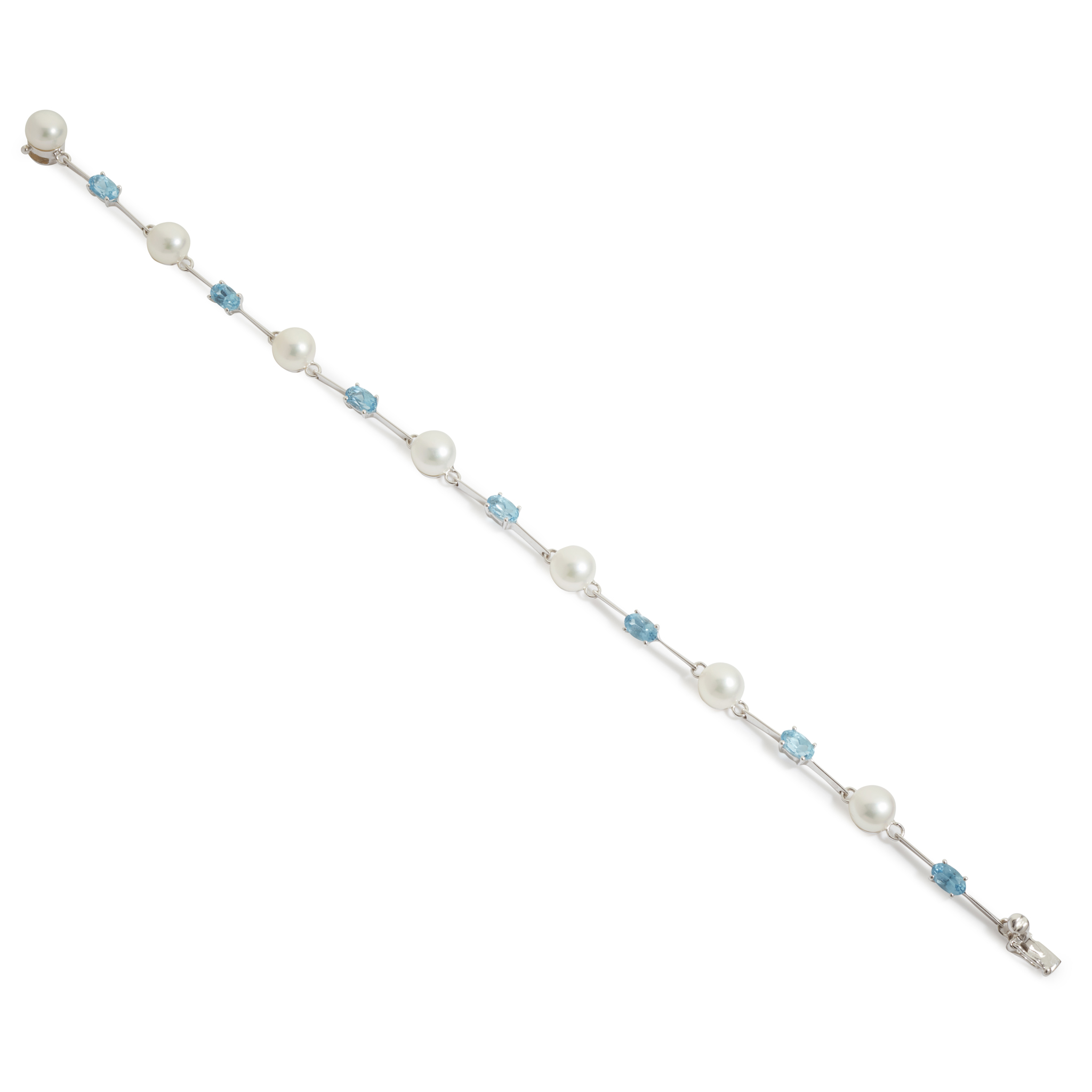 Claw-set with seven oval-cut blue topaz and seven cultured pearls, import hallmark