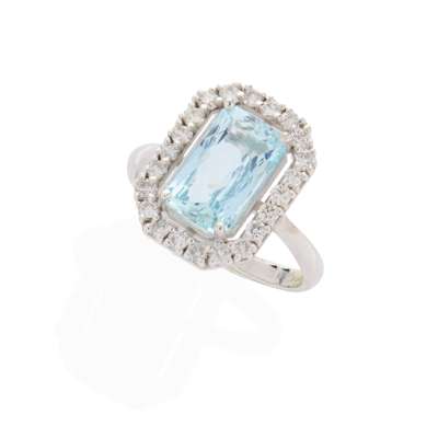 Claw-set with a rectangular mixed-cut aquamarine, in a border of round brilliant-cut diamonds, plain band, UK hallmarks