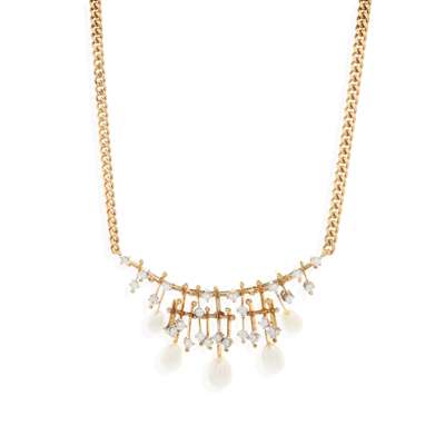 The central section of stylised geometric design, set throughout with round brilliant-cut diamonds, suspending five ovoid Scottish freshwater pearls, integral curb-link chain by Wellendorf, with diamond set W-charm, stamped 750