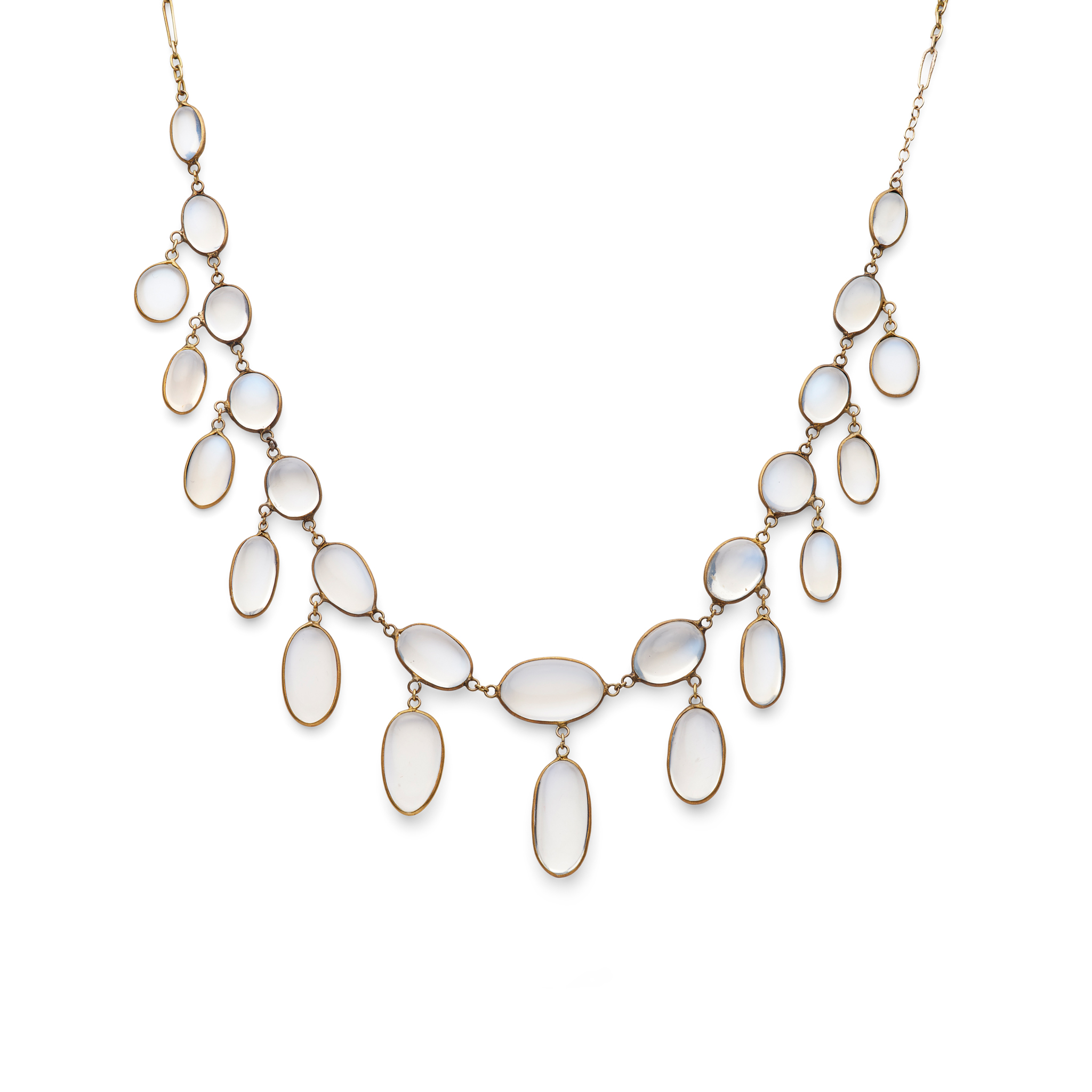 Composed of collet-set cabochon moonstone links with fringed detail, trace-link chain, unmarked