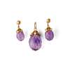 Each suspending a briolette-cut amethyst from a cannetille cap set with seed pearl detail, earrings with screw-back fittings, stamped 9ct (2)