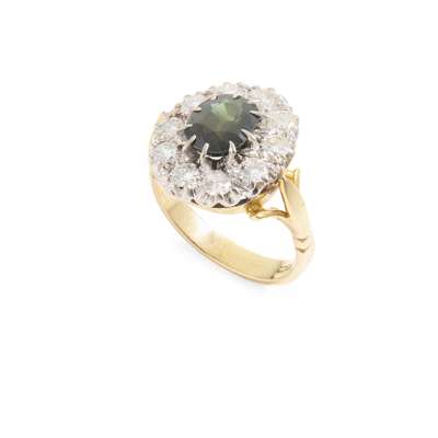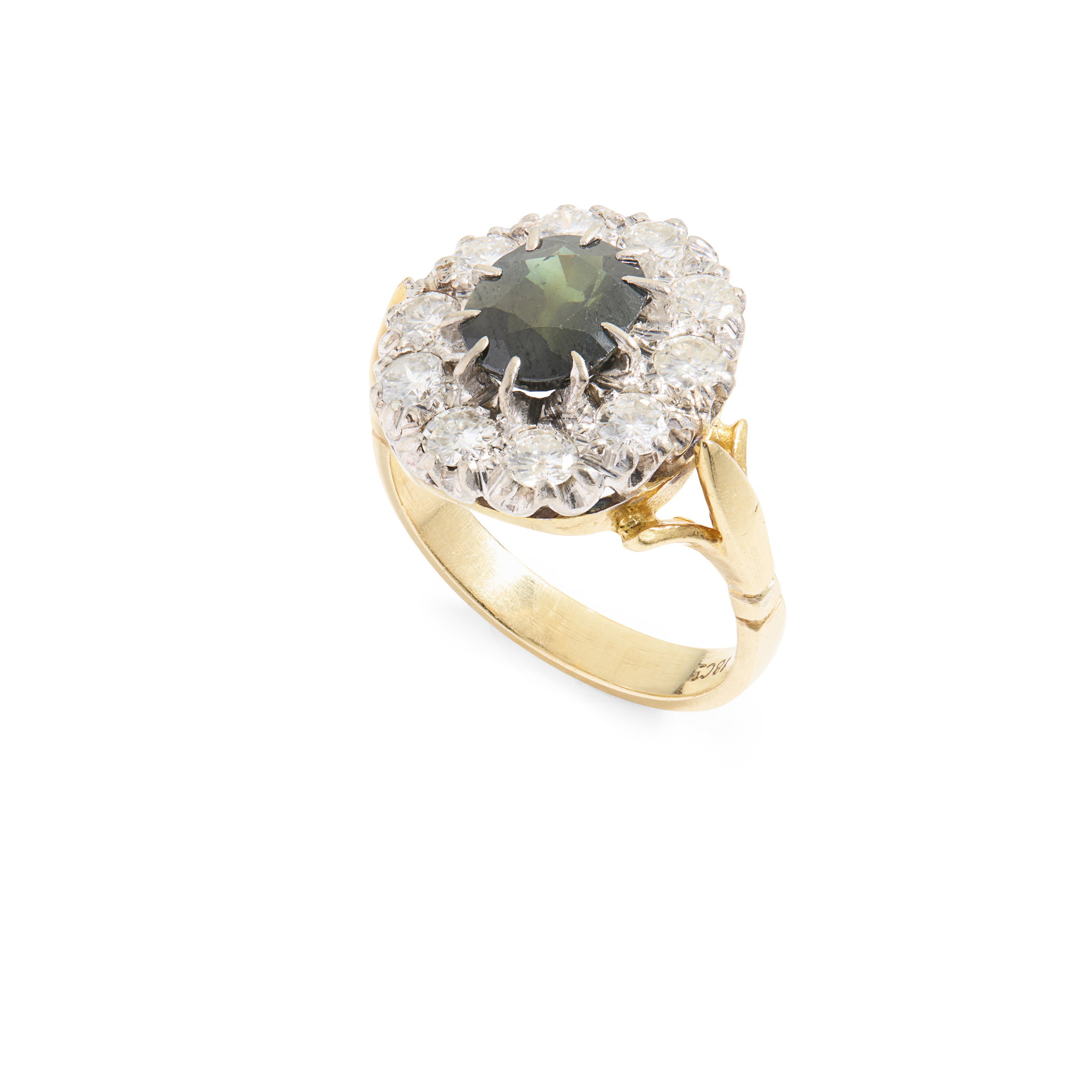 Claw-set with an oval-cut sapphire in a border of round brilliant-cut diamonds, plain band, stamped 18ct
