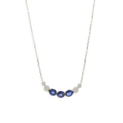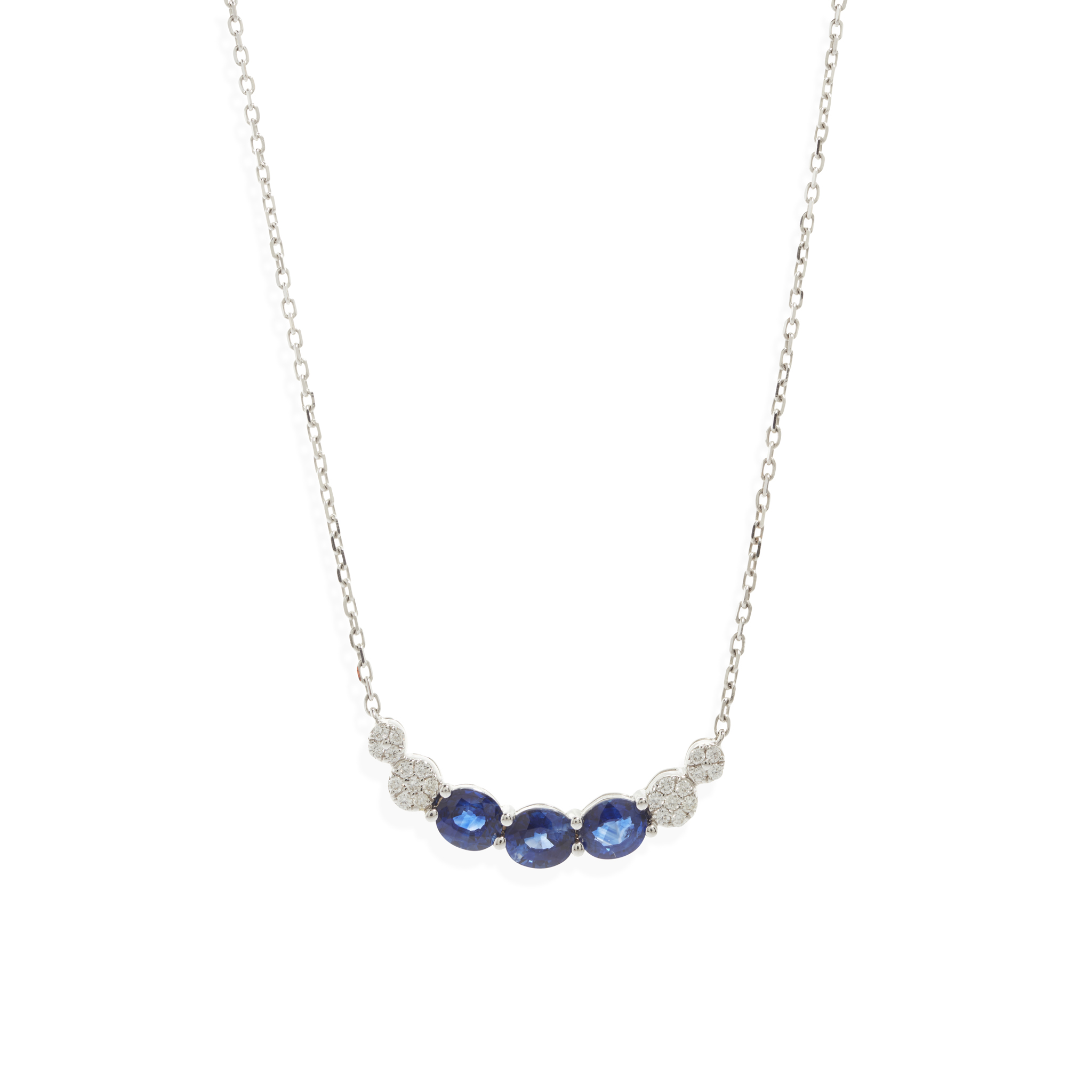 Claw-set with three oval-cut sapphires, and clusters of small round brilliant-cut diamonds, integral trace-link chain, stamped Au750