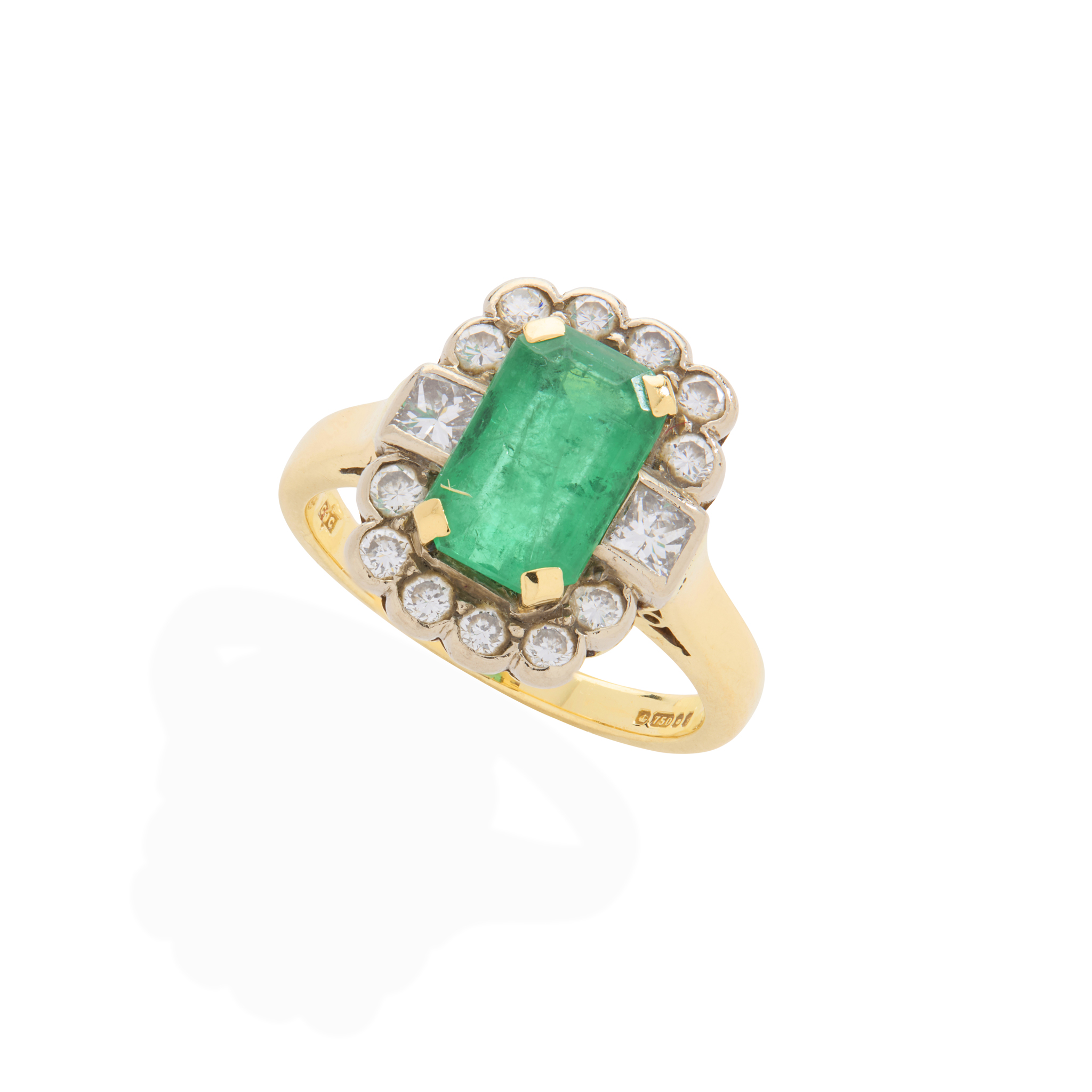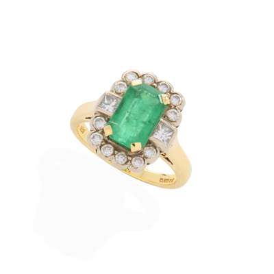 Claw-set with a rectangular step-cut emerald, in a border of round brilliant and princess-cut diamonds, plain band, UK hallmark