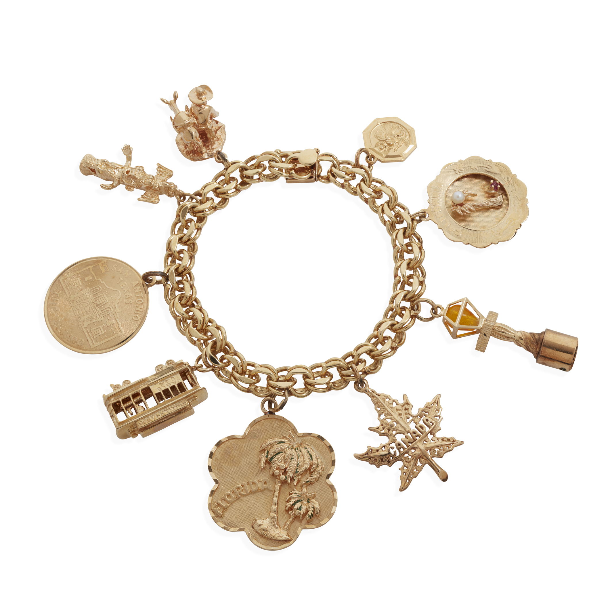 Composed of fancy curb-style links, stamped 18k; suspending various charms including a tram-car, a totem-pole, palm-trees etc., charms mostly stamped 14k