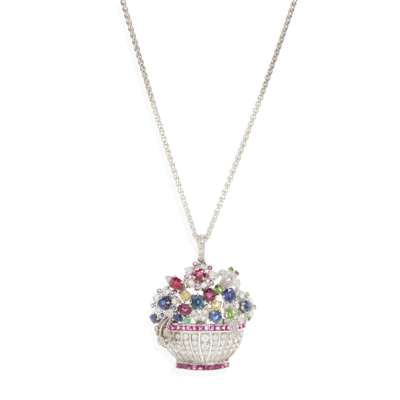 Modelled as a basket of flowers, set throughout with round, oval and cushion-cut rubies, emeralds and coloured sapphires, channel-set ruby detail, with graduated eight-cut diamonds, trace-link chain, stamped 750