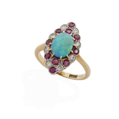 An opal doublet, ruby, and diamond ring