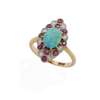 Claw-set with an opal doublet, in a navette-shaped surround set with eight-cut rubies and diamonds, plain band, stamped 18ct PLAT