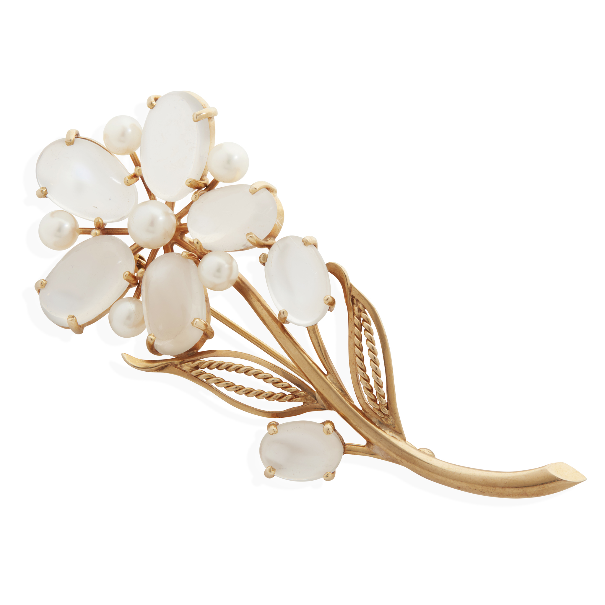 Set with oval cabochon moonstones and cultured pearls, the leaves with rope-twist detail, unmarked