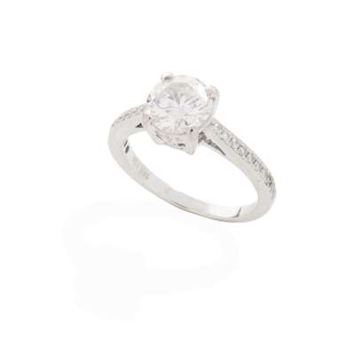 Claw-set with a round brilliant-cut diamond, weighing 1.30cts, the gallery and shoulders set with small round brilliant-cut diamonds, plain band, stamped 18K 750