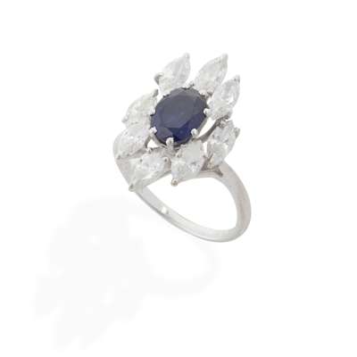 Claw-set with an oval-cut sapphire, in a border of eight marquise-cut diamonds, plain band, UK hallmark