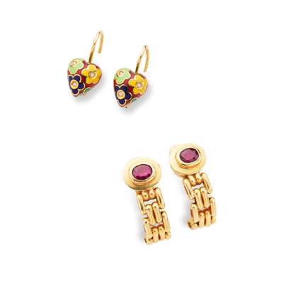 The first collet-set with an oval-cut garnet, with brick-link detail below, post and clip fittings, unmarked; the second pair modelled as a heart with enamelled floral detail, round-cut diamond details, hook and clip fittings, stamped 750 (2)